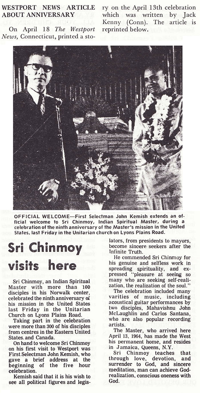 On hand to welcome Sri Chinmoy on his first visit to Westport was First Selectman John Kemish, who gave a brief address at the beginning of the five hour celebration.