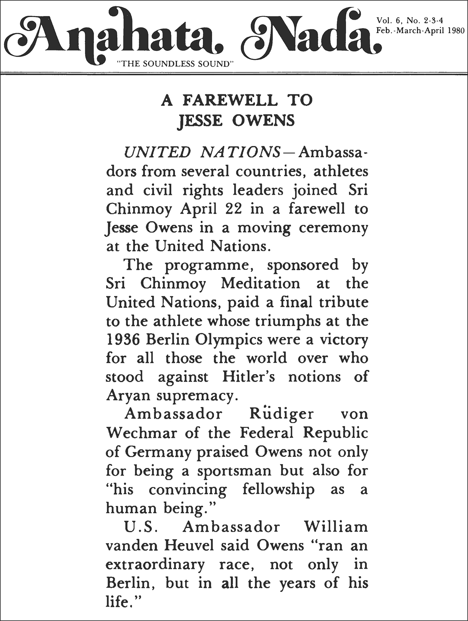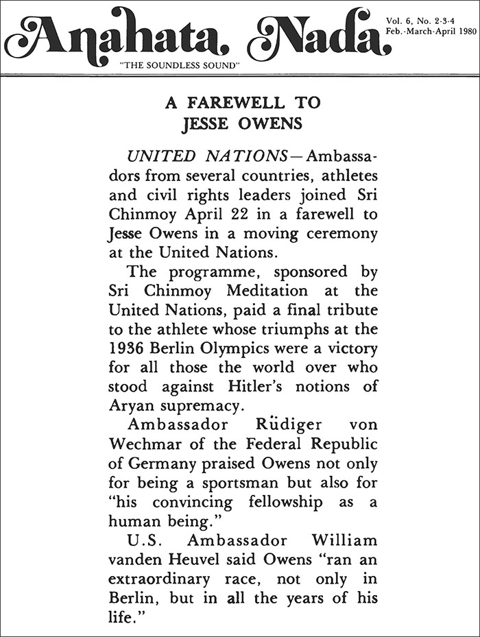 UNITED NATIONS — Ambassadors from several countries, athletes and civil rights leaders joined Sri Chinmoy April 22 in a farewell to Jesse Owens in a moving ceremony at the United Nations.