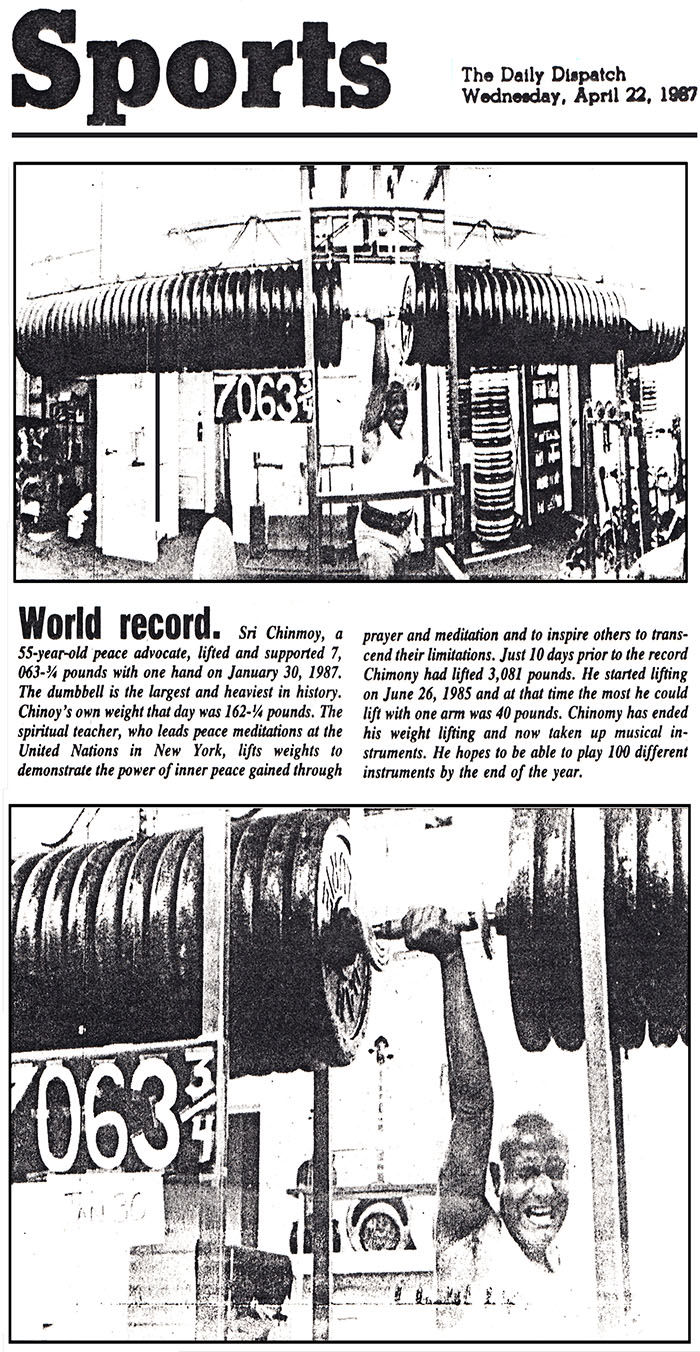 Sri Chinmoy, a 55-year-old peace advocate, lifted and supported 7,063-¾ pounds with one hand on January 30, 1987. The dumbbell is the largest and heaviest in history. Chinmoy’s own weight that day was 162-¼ pounds. The spiritual teacher, who leads peace meditations at the United Nations in New York, lifts weights to demonstrate the power of inner peace gained through prayer and meditation and to inspire others to transcend their limitations. Just 10 days prior to the record Chinmoy had lifted 3,081 pounds. He started lifting on June 26, 1985 and at that time the most he could lift with one arm was 40 pounds. Chinmoy has ended his weight lifting and now taken up musical instruments. He hopes to be able to play 100 different instruments by the end of the year.