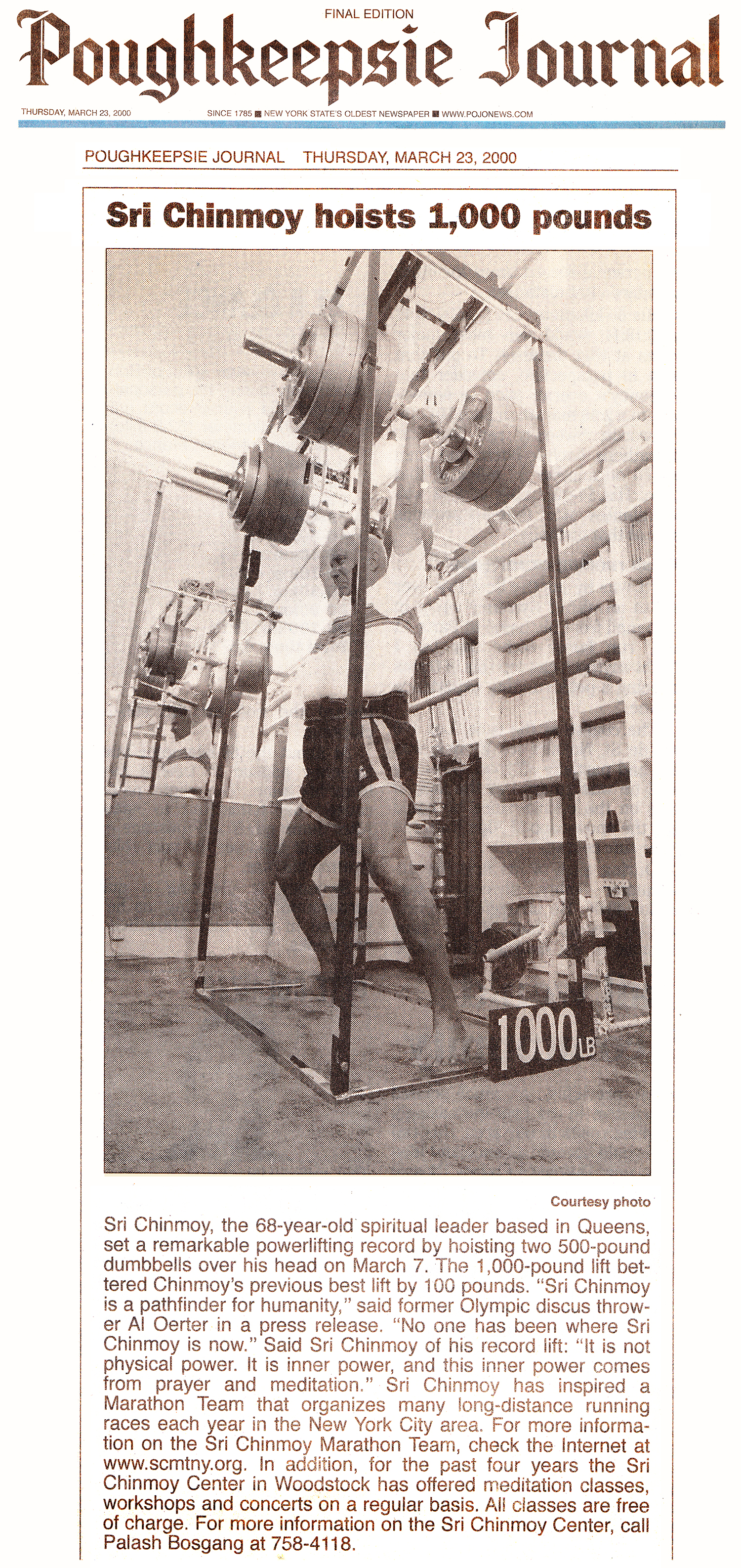 March 7[February 16]. The 1,000-pound lift bettered Chinmoy’s previous best lift by 100 pounds. “Sri Chinmoy is a pathfinder for humanity,” said former Olympic discus thrower Al Oerter in a press release, “No one has been where Sri Chinmoy is now.” Said Sri Chinmoy of his record lift: '“It is not physical power. It is inner power, and this inner power comes from prayer and meditation.” Sri Chinmoy has inspired a Marathon Team that organizes many long-distance running races each year in the New York City area. For more information on the Sri Chinmoy Marathon Team, check the Internet at www.srichinmoyraces.org. In addition, for the past four years the Sri Chinmoy Center in Woodstock has offered meditation classes, workshops, and concerts on a regular basis. All classes are free of charge.