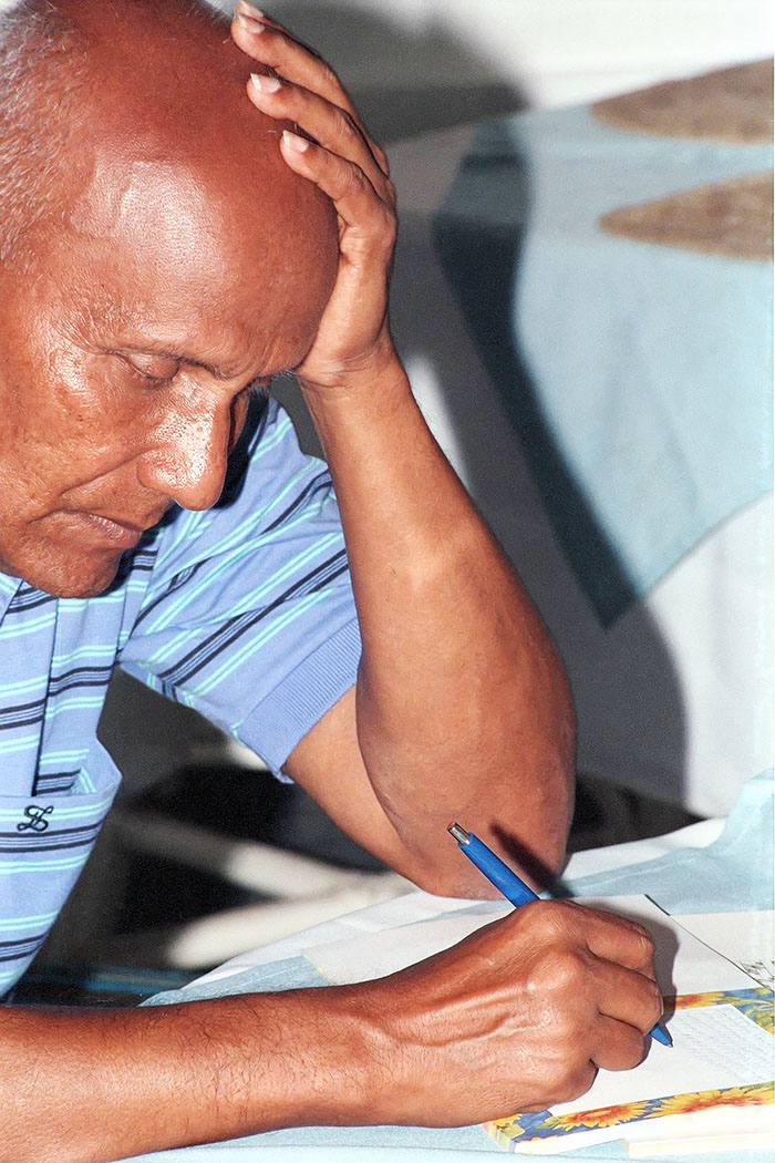 1994 Photo by Prashphutita Greco Sri Chinmoy in deep concentration, sketching his soul-bird drawings. The total for the day is 5,592, bringing his all-tine total to 861,906.