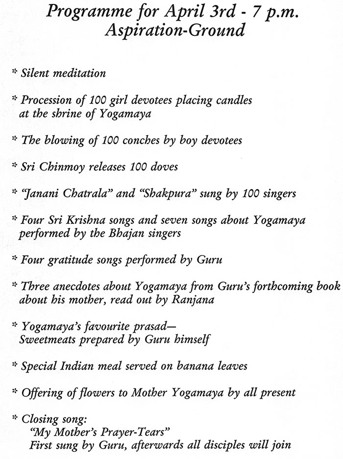 She was aided in her feat by the inner presence of her spiritual Master, Sri Chinmoy, whose photograph she frequently glanced at and whose music was playing on a small tape recorder. Also of help were the heaping spoonsful of ice cream fellow-disciples handed her whenever she burned her tongue.