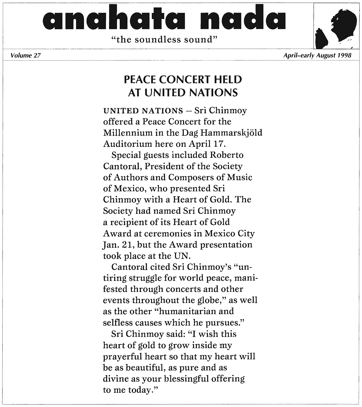 Sri Chinmoy is named ‘Messenger of the Millennium’ by the Department of Theology and Religious Studies at St. John’s University in Jamaica, NY, USA, where he is invited to perform a concert and give a talk on the New Millennium, entitled ‘The New Millennium and World Peace’. Sri Chinmoy is also made an honorary member of Theta Alpha Kappa, the National Honour Society for Theology.