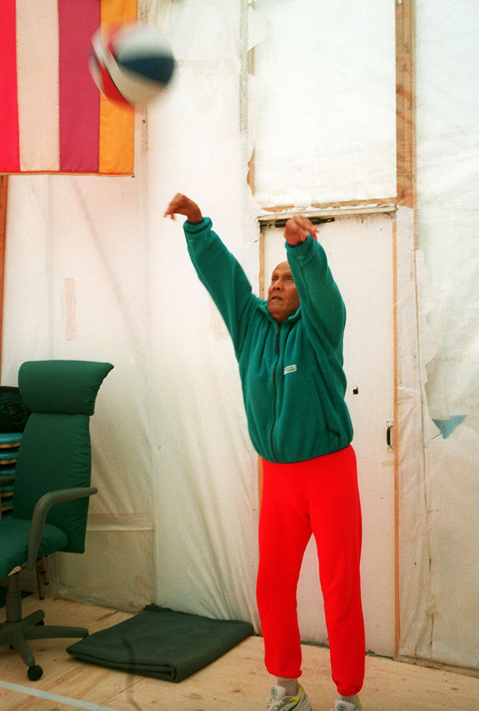 Sri Chinmoy lifts 30 people at the Langkawi Lagoon Resort in Langkawi, Malaysia.