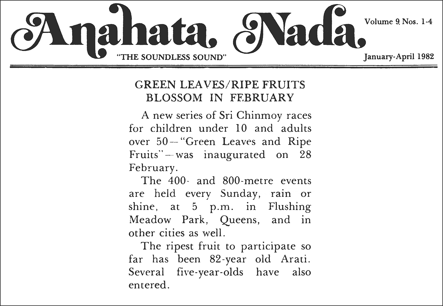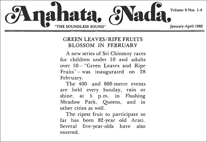 Green Leaves and Ripe Fruits, a new series of Sri Chinmoy races for children under 10 and adults over 50, is inaugurated at Flushing Meadows Park, Queens, New York. The 400-and 800-metre events will continue to be held there every Sunday at 5 p.m., rain or shine.