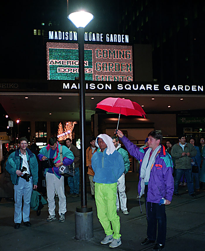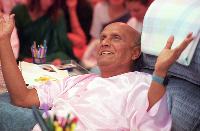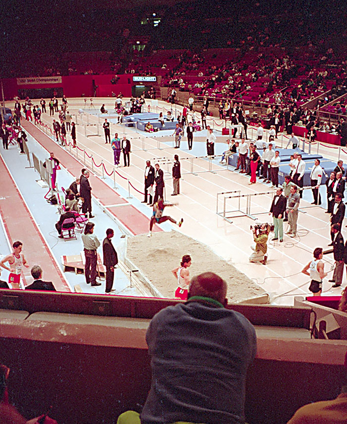 Sri Chinmoy attends the Mobil Games at Madison Square Garden to watch Carl Lewis compete in the long jump in New York, NY, USA.