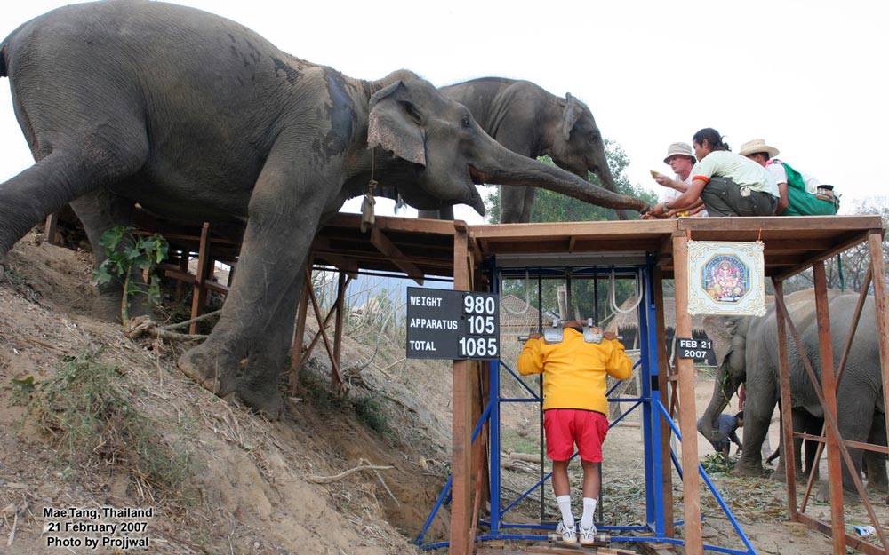 Sri Chinmoy lifts two baby elephants separately – the heaviest of which is a one-year-old weighing 969 lbs. (1,074 lbs. including platform) — using a standing calf-raise machine with a shoulder-height overhead platform, at the Maetaeng Elephant Park, in Chiang Mai Province, Thailand.