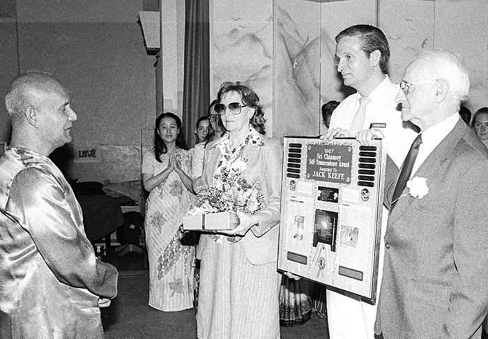 Sri Chinmoy speaks with Jack Keefe, his wife Wanda (left) and his son Adhiratha (centre). In 1985, Adhiratha became the first UNICEF staff member and among the first of Sri Chinmoy’s students to swim the English Channel. His swim was in honour of the 40th Anniversary of the United Nations.