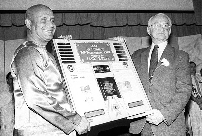 Sri Chinmoy presents the Sri Chinmoy Self-Transcendence Award to Jack Keefe in Jamaica, New York. After an almost 50-year break from competitive swimming, Jack has now become one of America's top backstrokers in his age group.
