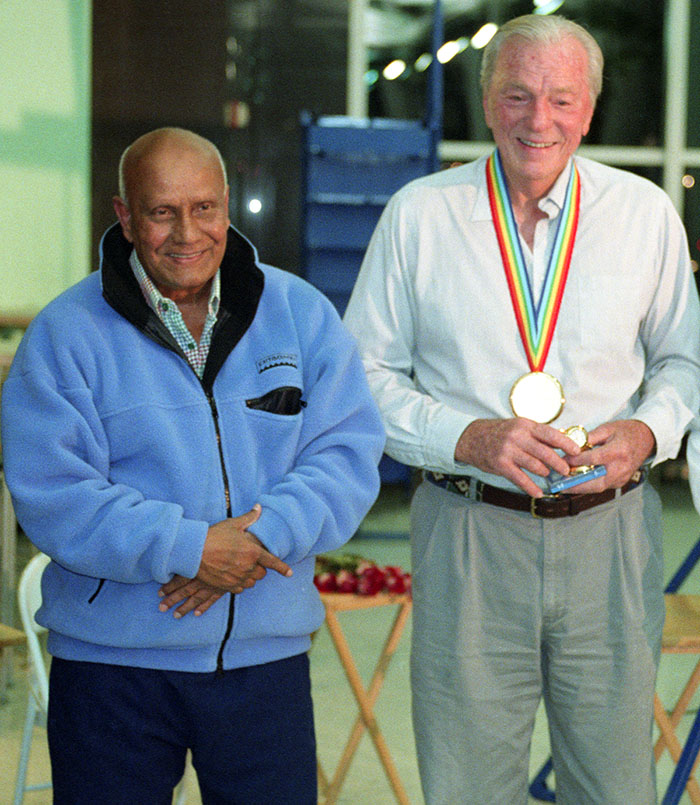 2004 Photo by Pulak Viscardi Sri Chinmoy lifts Bob Mathias, 2-time Olympic gold medallist in the decathlon (1948 & 1952), at JFK International Airport in New York.