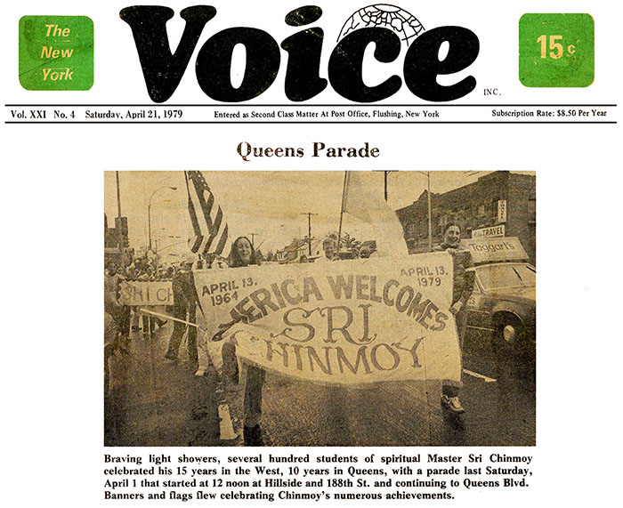 Braving light showers, several hundred students of spiritual Master Sri Chinmoy celebrated his 15 years in the West, 10 years in Queens, with a parade last Saturday, April 14 that started at 12 noon at Hillside and 188th St. and continuing to Queens Blvd. Banners and flags flew celebrating Chinmoy’s numerous achievements.