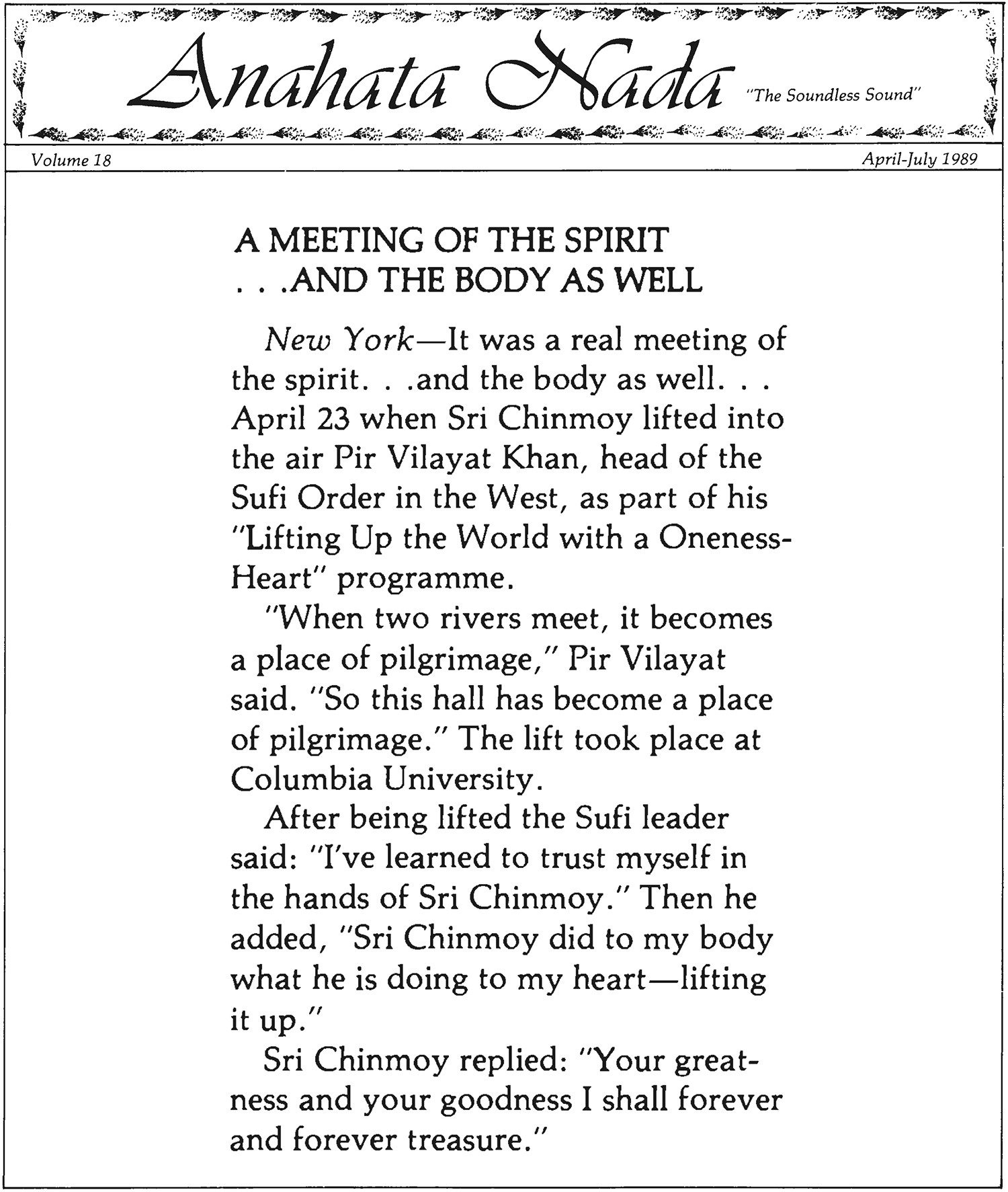 New York — It was a real meeting of the spirit ... and the body as well... April 23 when Sri Chinmoy lifted into the air Pir Vilayat Khan, head of the Sufi Order in the West, as part of his ‘Lifting Up the World with a Oneness-Heart’ programme.