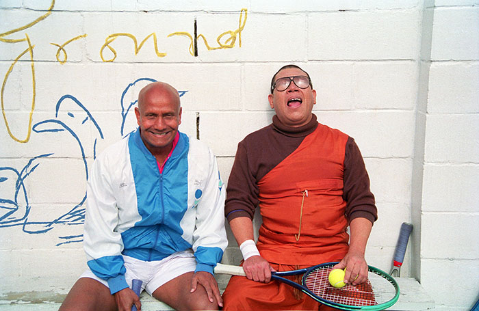 Sri Chinmoy plays tennis with Buddhist monk Luang Por Eed (Paramarthatita), at Aspiration-Ground in Jamaica, New York.