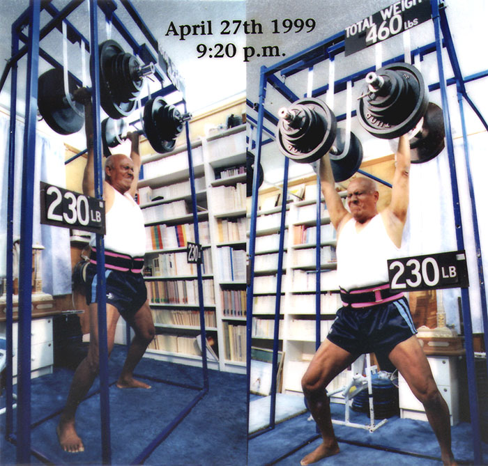Sri Chinmoy lifts 230 lbs. with both arms simultaneously, for a total of 460 lbs., in Jamaica, New York.