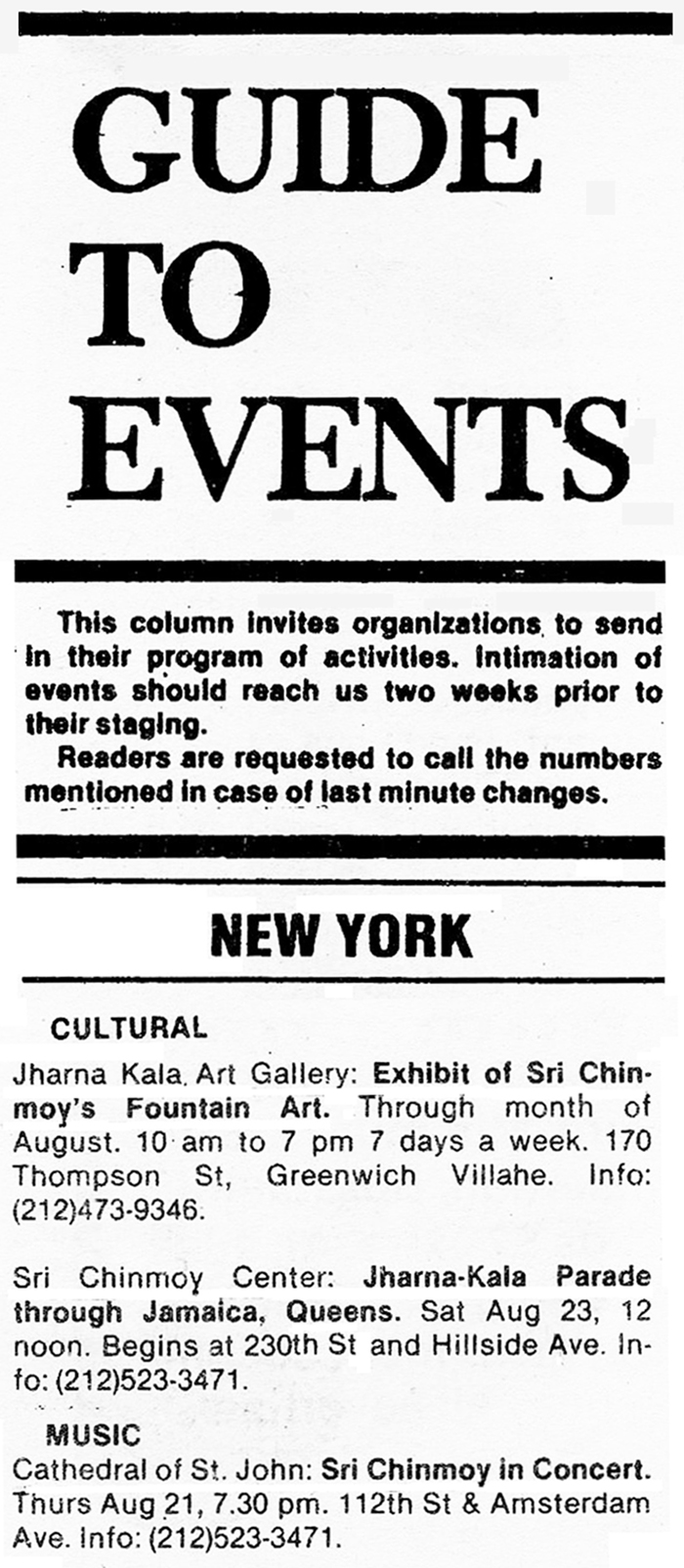 Sri Chinmoy Centre: Jharna-Kala Parade through Jamaica, Queens. Sat Aug 23, 12 noon. Begins at 230th St and Hillside Ave.