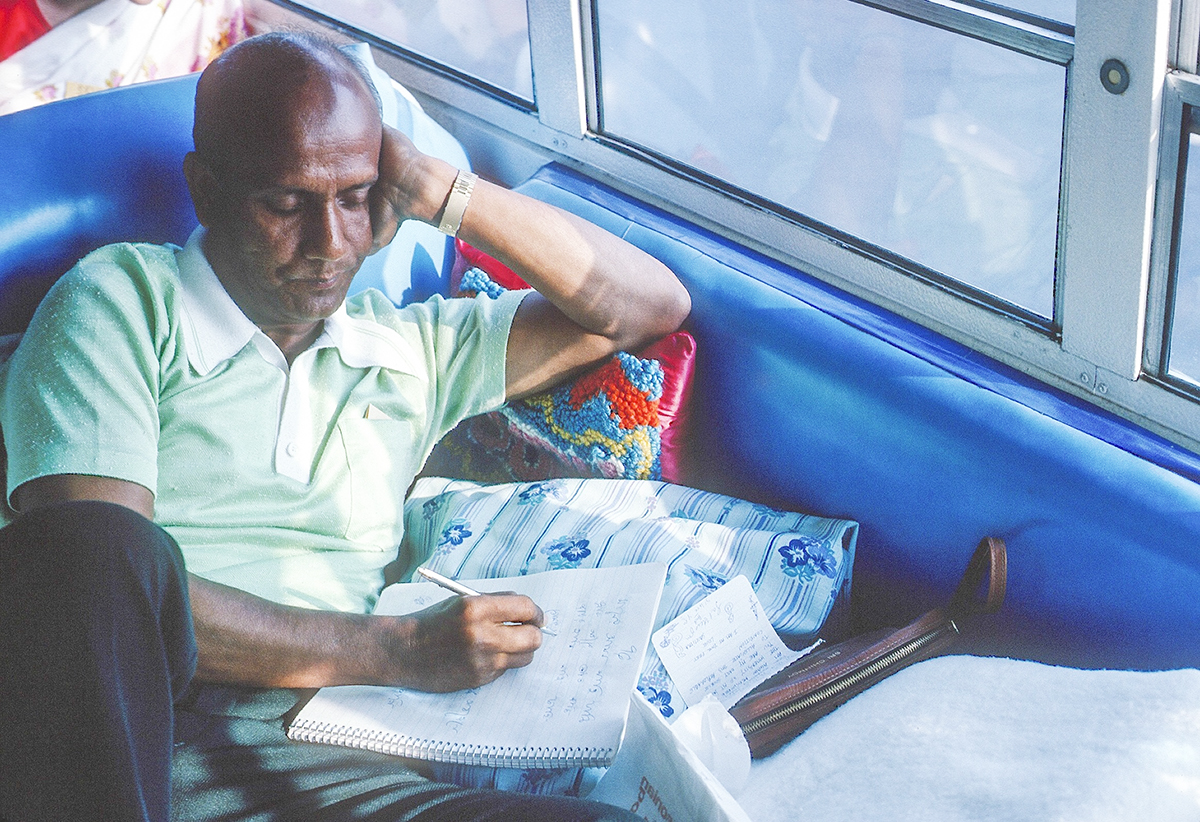 Sri Chinmoy on a bus trip with his students, writing by hand in his trusty notebooks just as he did so many years ago in India.