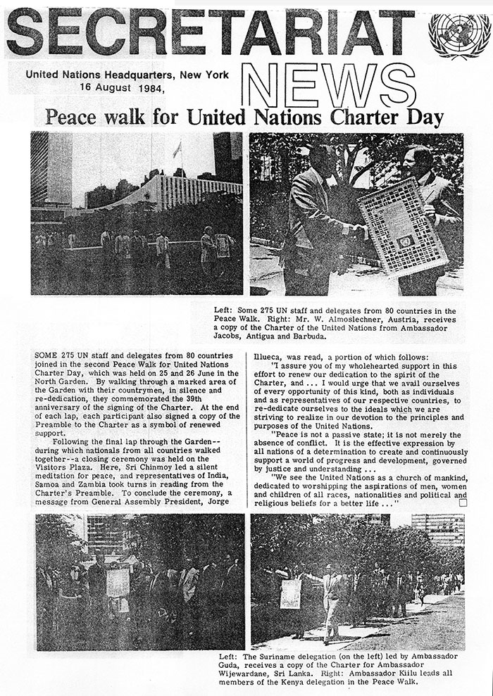 SOME 275 UN staff and delegates from 80 countries joined in the second Peace Walk for United Nations Charter Day, which was held on 25 and 26 June in the North Garden. By walking through a marked area of the Garden with their countrymen, in silence and re-dedication, they commemorated the 39th anniversary of the signing of the Charter. At the end of each lap, each participant, also signed a copy of the Preamble to the Charter as a symbol of renewed support.