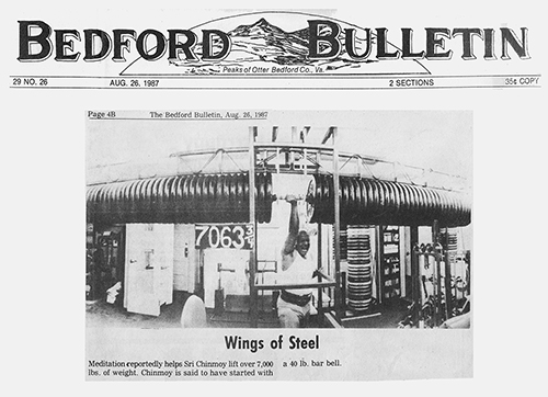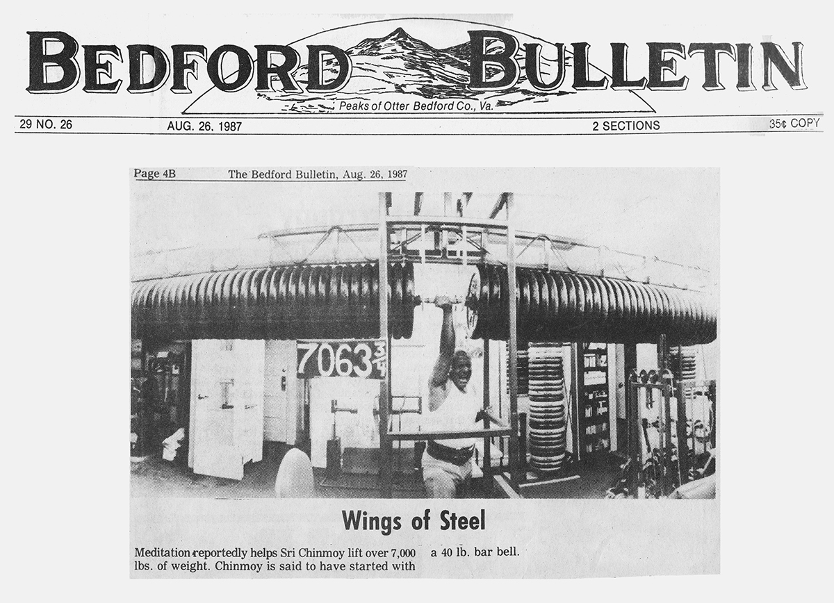 1987 Wings of Steel Meditation reportedly helps Sri Chinmoy lift over 7,000 lbs. of weight. Chinmoy is said to have started with a 40 lb. barbell. Published in the Bedford Bulletin, August 26, 1987
