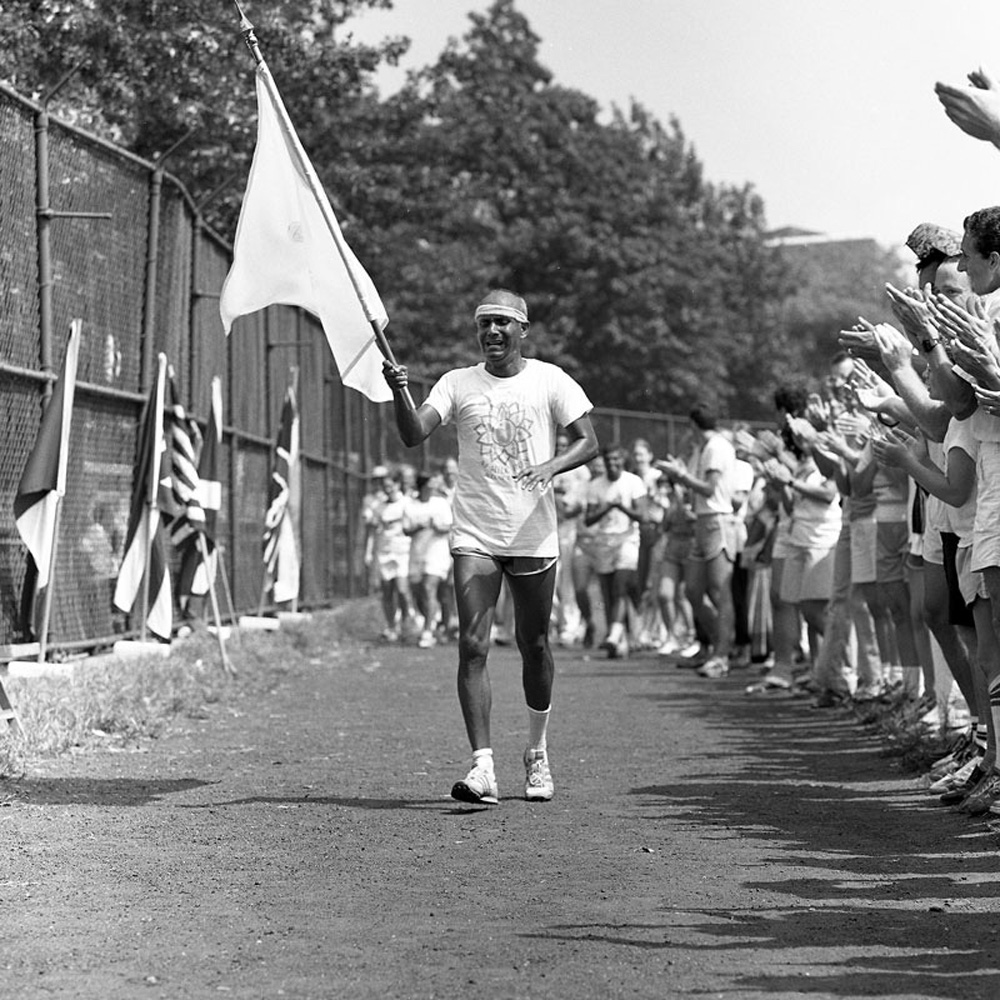 Sri Chinmoy finishes the 3rd annual 47 Mile Race at Jamaica High School track in Jamaica, Queens, New York, in a time of 11 hours, 27 minutes and 24 seconds.