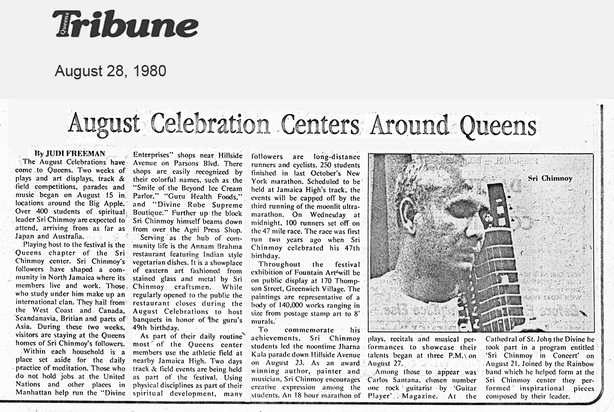 Among those to appear was Carlos Santana, chosen number one rock guitarist by ‘Guitar Player’. At the Cathedral of St. John the Divine he took part in a program entitled ‘Sri Chinmoy in Concert’ on August 21. Joined by the Rainbow band which he helped form at the Sri Chinmoy center they performed inspirational pieces composed by their leader.
