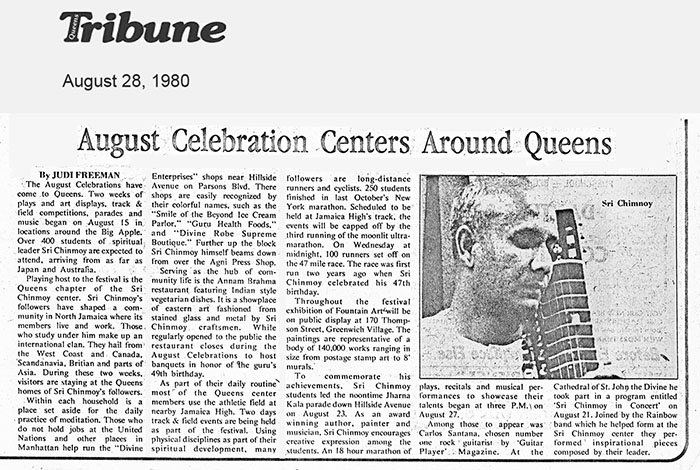 The August Celebrations have come to Queens. Two weeks of plays and art displays, track & field competitions, parades and music began on August 15 in locations around the Big Apple. Over 400 students of spiritual leader Sri Chinmoy are expected to attend, arriving from as far as Japan and Australia.