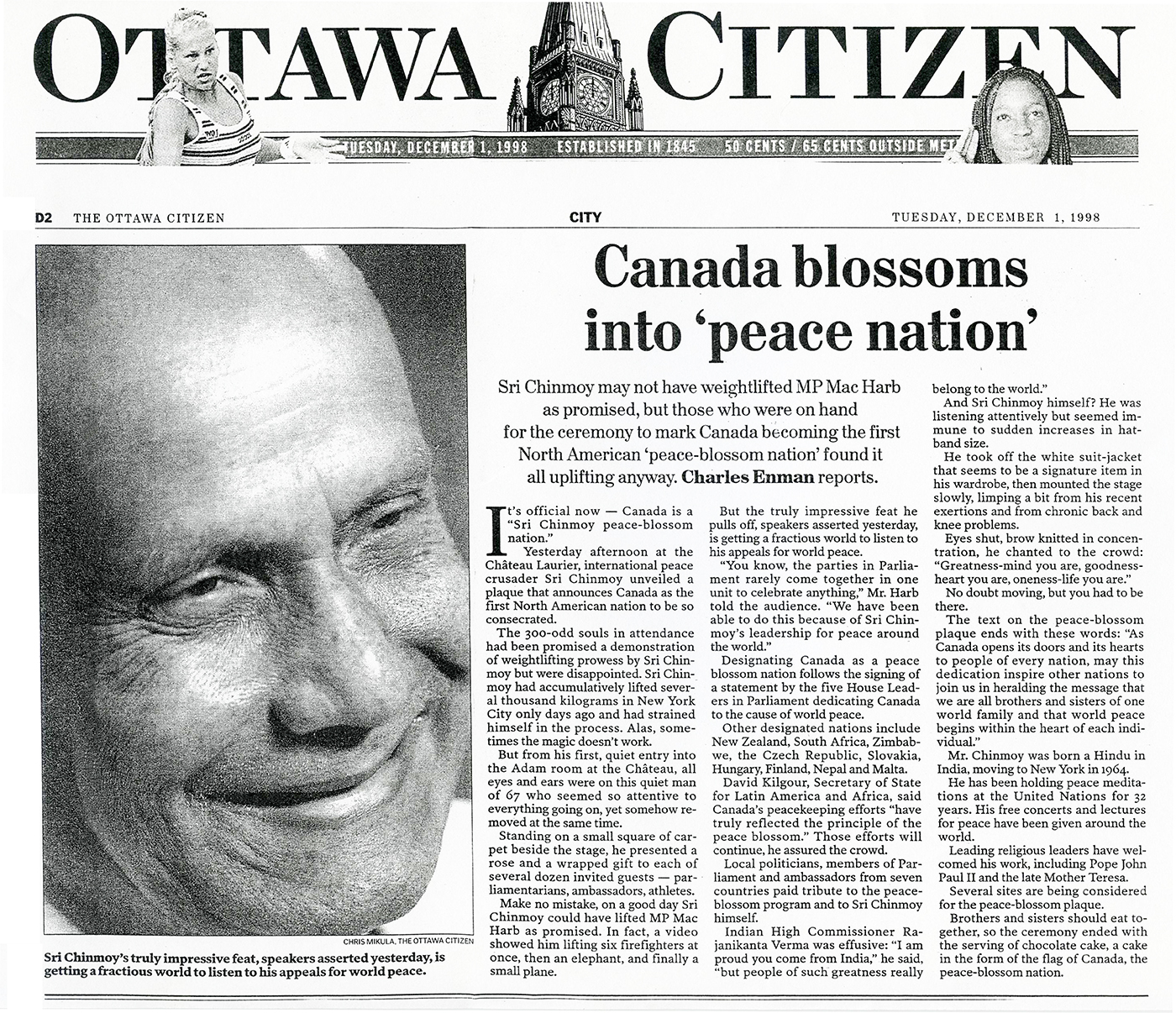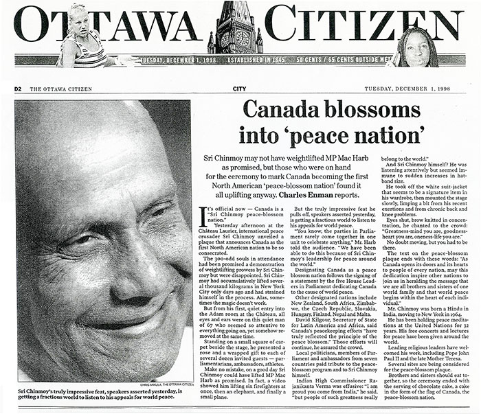 Sri Chinmoy may not have weightlifted MP Mac Harb as promised, but those who were on hand for the ceremony to mark Canada becoming the first North American 'peace-blossom nation' found it all uplifting anyway. Charles Enman reports.