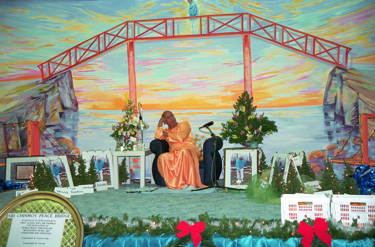 1990 Sri Chinmoy at a celebration in Jamaica, Queens, New York, for the first bridge — connecting the towns of Cumberland and Central Falls on Rhode Island — becoming a Sr Chinmoy Peace-Blossom.