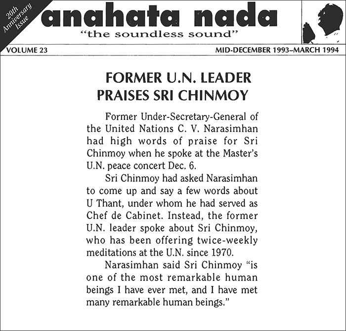 Sri Chinmoy had asked Narasimhan to come up and say a few words about U Thant, under whom he had served as Chef de Cabinet. Instead, the former U.N. leader spoke about Sri Chinmoy, who has been offering twice-weekly meditations at the U.N. since 1970.