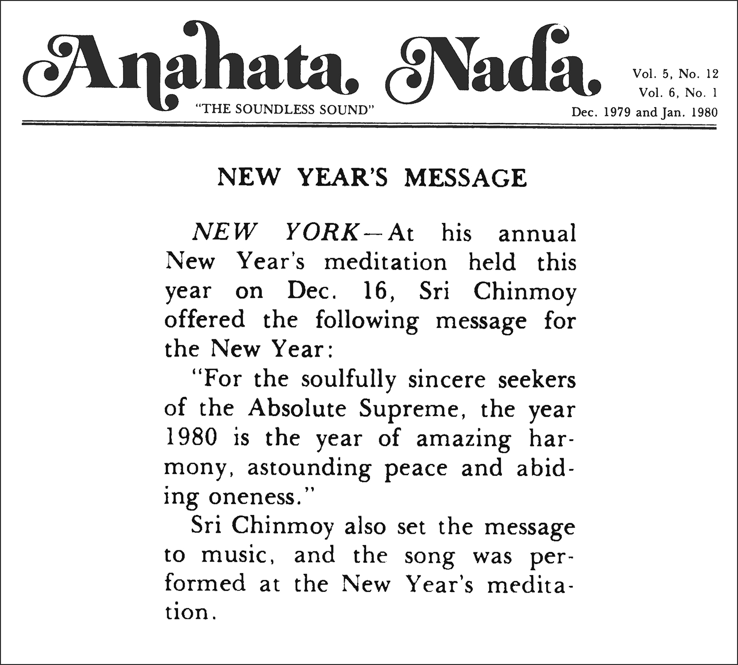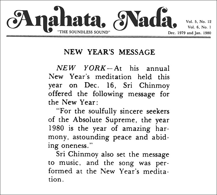 “For the soulfully sincere seekers of the Absolute Supreme, the year 1980 is the year of amazing harmony, astounding peace and abiding oneness.”
