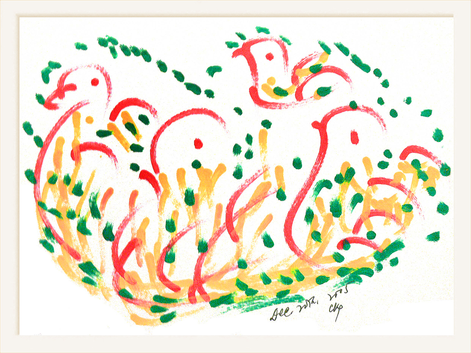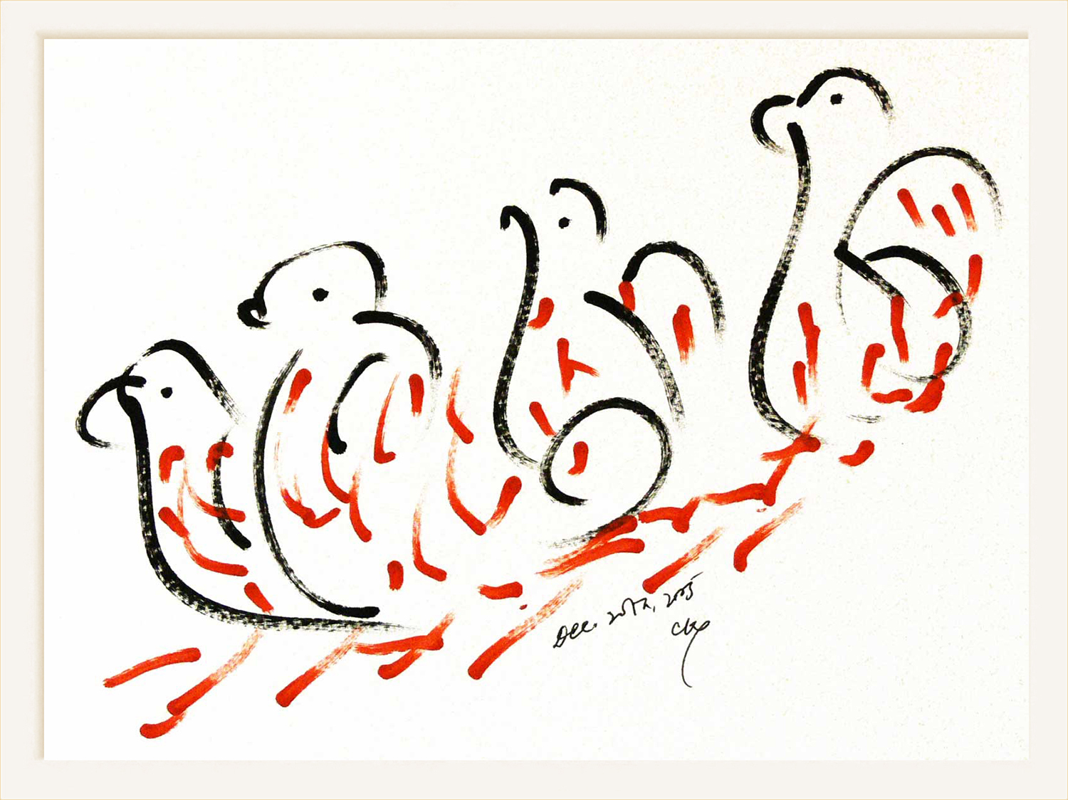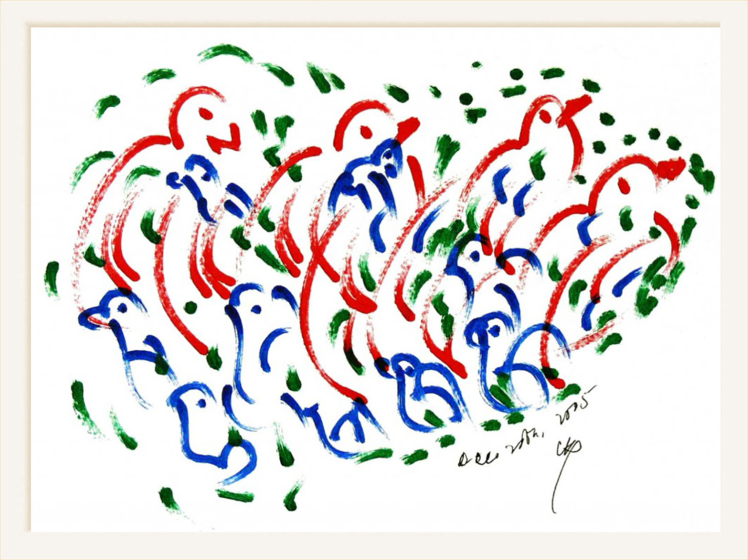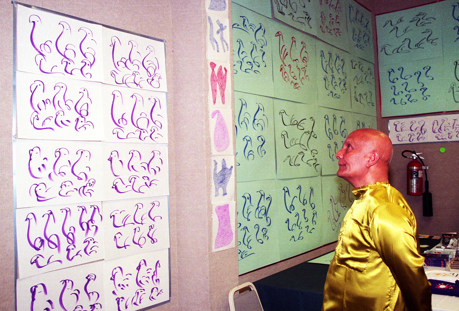 1997 Sri Chinmoy observes the display of his soul-bird drawings at the Jharna-Kala exhibit held at the Hotel Barceló Del Lago in Panajachel, Guatemala. 2005