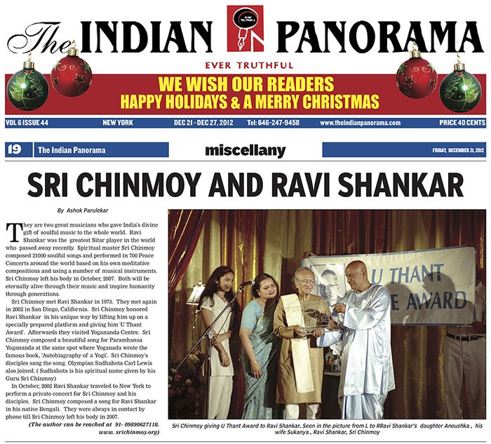 Sri Chinmoy met Ravi Shankar in 1973. They met again in 2002 in San Diego, California. Sri Chinmoy honored Ravi Shankar in his unique way by lifting him up on a specially prepared platform and giving him ‘U Thant Award’. Afterwards they visited Yogananda Centre. Sri Chinmoy composed a beautiful song for Paramhansa Yogananda at the same spot where Yoganada wrote the famous book, ‘Autobiagraphy of a Yogi’. Sri Chinmoy’s disciples sang the song. Olympian Sudhahota Carl Lewis also joined. (Sudhahota is his spiritual name given by his Guru Sri Chinmoy) In October, 2002 Ravi Shankar traveled to New York to perform a private concert for Sri Chinmoy and his disciples. Sri Chinmoy composed a song for Ravi Shankar in his native Bengali. They were always in contact by phone till Sri Chinmoy left his body in 2007.