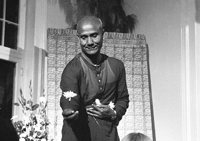 1977 Photo by Sarama Minoli Sri Chinmoy offering flowers after meditation at The Sherwood Hotel in Bermuda.