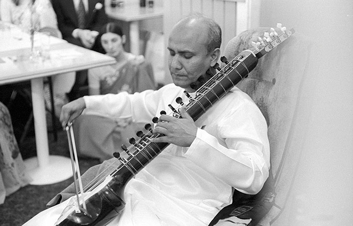 Sri Chinmoy plays the esraj at a special function for United Nations diplomats and staff, held at Annam Brahma restaurant in Jamaica, Queens, New York.