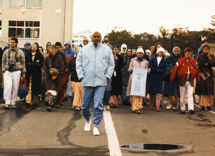 Sri Chinmoy leads a silent peace walk as part of a Peace Ceremony at the Hiroshima Peace Memorial Park in Japan.