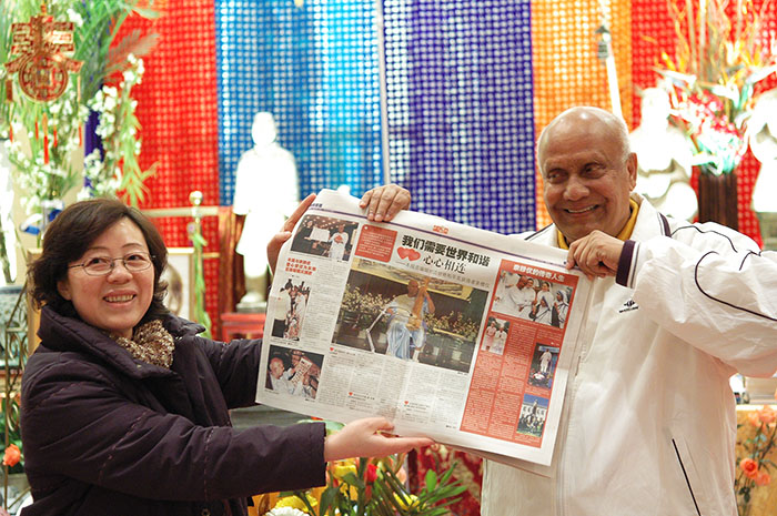 2005 Photo by Maral Siegel Editor-in-Chief of the Beijing Science and Technology Report, Zhao Ying Hua, travels to Xi’an in Shaanxi Provence to show Sri Chinmoy the centre-spread feature article she had written about him.