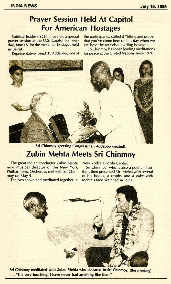 Sri Chinmoy meditated with Zubin Mehta who declared to Sri Chinmoy, (the meeting) ... “It’s very touching. I have never had anything like that.”