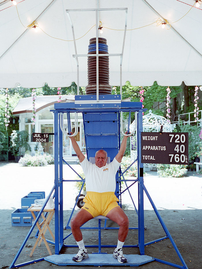 2004 Photo by Pulak Viscardi Sri Chinmoy trains with massive weights using a seated two-arm lift at Aspiration-Ground in Jamaica, New York.