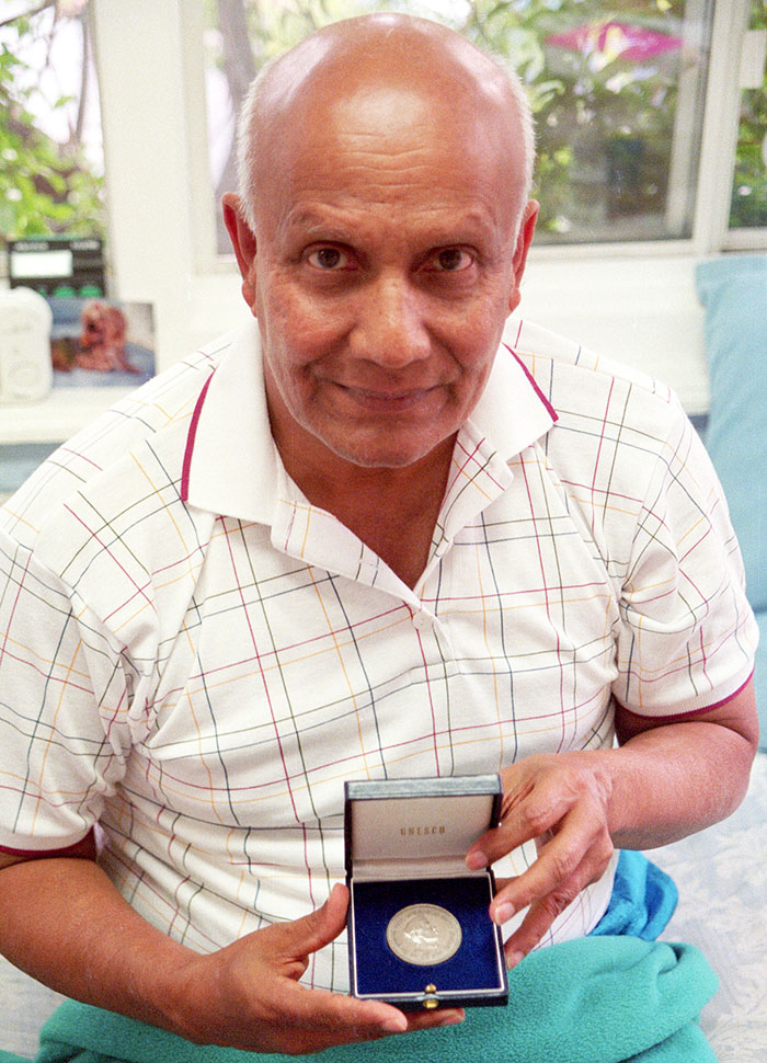 1997 Photo by Pulak Viscardi Sri Chinmoy at home in New York shows his Nehru Medallion that was presented to him by UNESCO in Paris a few years earlier.