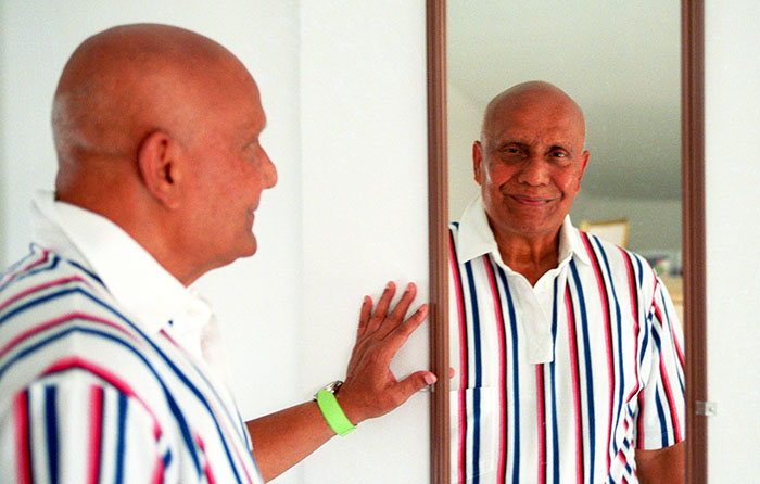 Sri Chinmoy catches his reflection in a mirror at the home of Kritagyata Nicholls on Normal Road in Jamaica, Queens, New York.