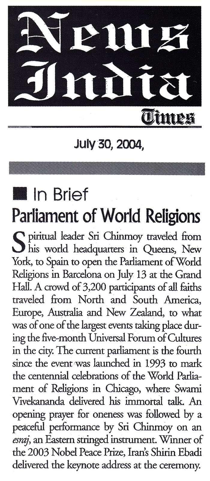 Spiritual leader Sri Chinmoy traveled from his world headquarters in Queens, New York to Spain to open the Parliament of World Religions in Barcelona on July 13 at the Grand Hall. A crowd of 3,200 participants of all faiths traveled from North and South America, Europe, Australia and New Zealand, to what was of one of the largest events taking place during the five-month Universal Forum of Cultures in the city. The current parliament is the fourth since the event was launched in 1993 to mark the centennial celebrations of the World Parliament of Religions in Chicago, where Swami Vivekananda delivered his immortal talk. An opening prayer for oneness was followed by a peaceful performance by Sri Chinmoy on an esraj, an Eastern stringed instrument. Winner of the 2003 Nobel Peace Prize, Iran’s Shirin Ebadio delivered the keynote address at the ceremony