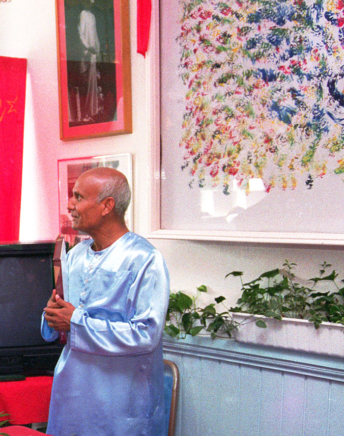 Sri Chinmoy hosts a function at Annam Brahma Restaurant in Jamaica, New York. On the wall hangs one of his large Jharna-Kala paintings.