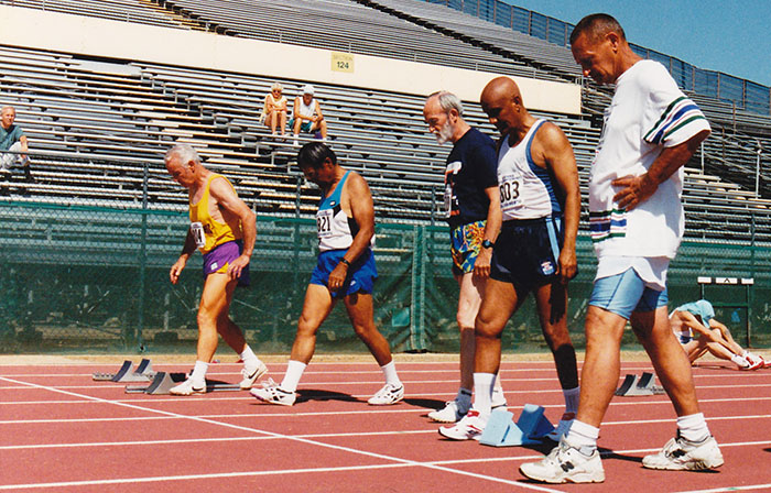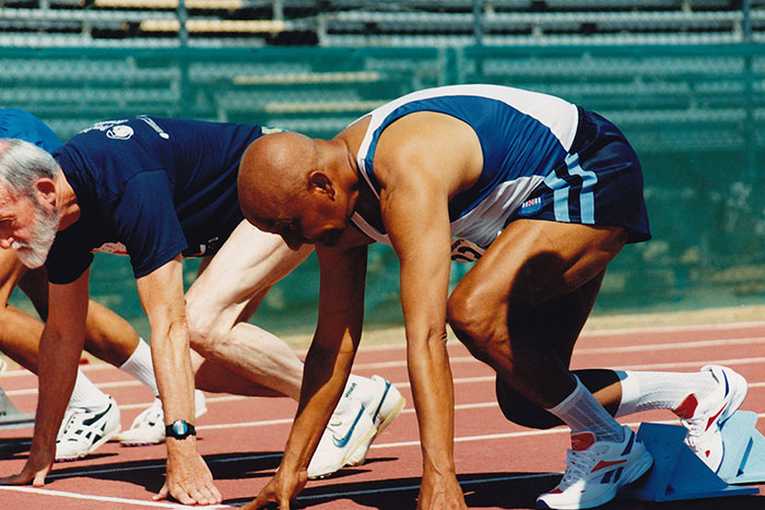 1996 Sri Chinmoy runs 50 metres in 7.9 sec. at the California Senior Masters Games in Sacramento, California.