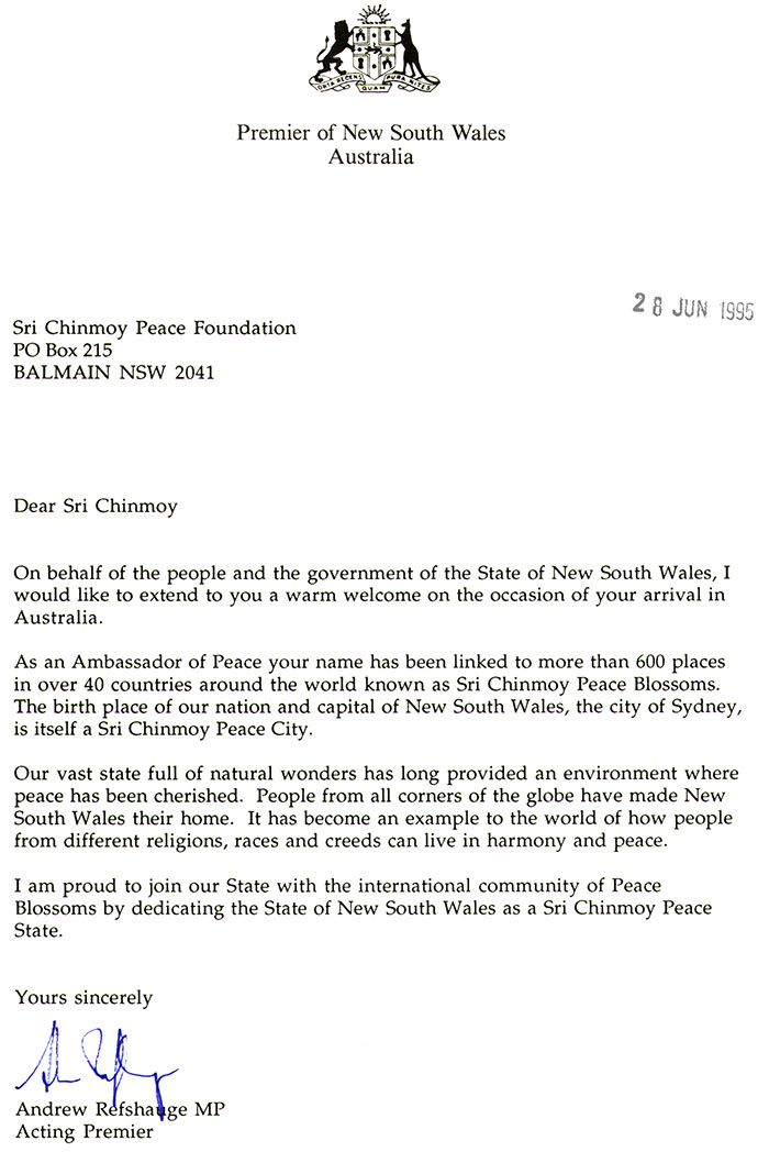 I am proud to join our State with the international community of Peace-Blossoms by dedicating the State of New South Wales as a Sri Chinmoy Peace State.