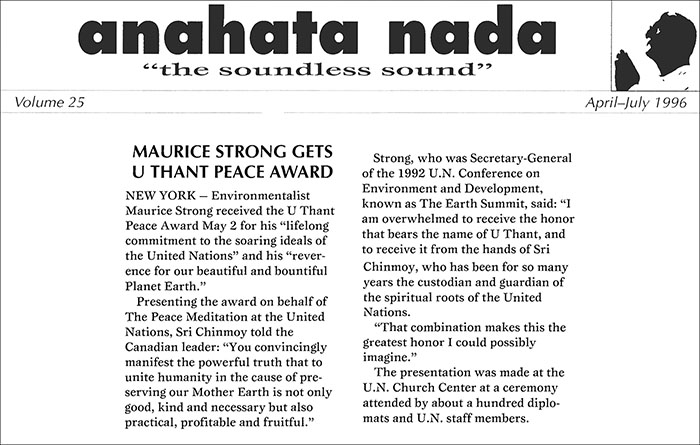 Strong, who was Secretary-General of the 1992 U.N. Conference on Environment and Development, known as The Earth Summit, said: “l am overwhelmed to receive the honour that bears the name ofU Thant, and to receive it from the hands of Sri Chinmoy, who has been for so many years the custodian and guardian of the spiritual roots of the United Nations.