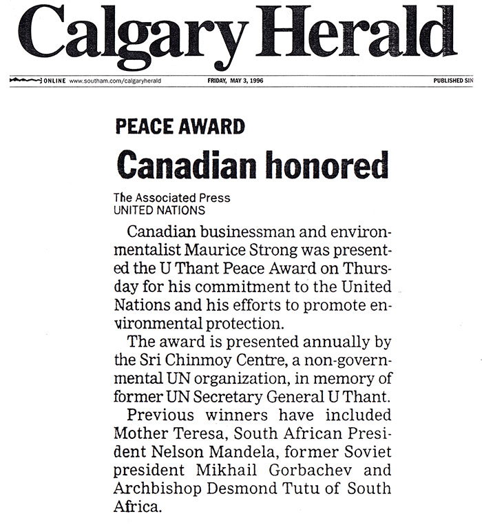 UNITED NATIONSCanadian businessman and environmentalist Maurice Strong was presented the U Thant Peace Award on Thursday for his commitment to the United Nations and his efforts to promote environmental protection.