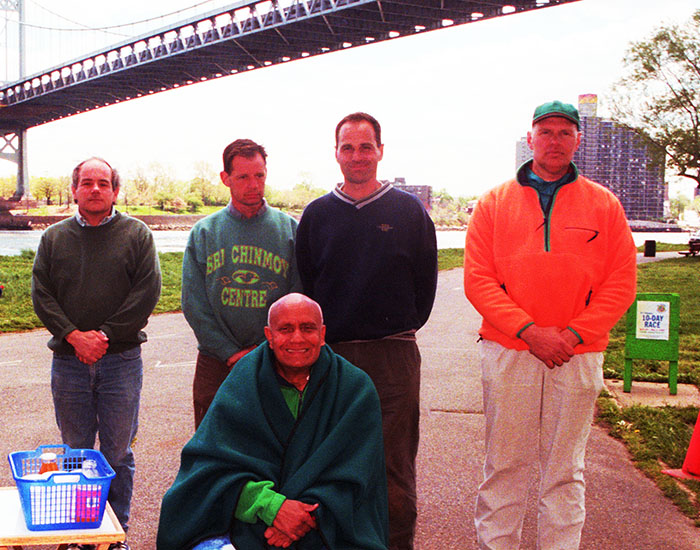 Sri Chinmoy pays tribute to the race directors of the Sri Chinmoy Ten-Day Race by having a photograph taken with them. Standing, from left to right, are Sandhani Fitch, Bipin Larkin, Rupantar La Russo and Sahishnu Szczesiul at Wards Island Park in New York.