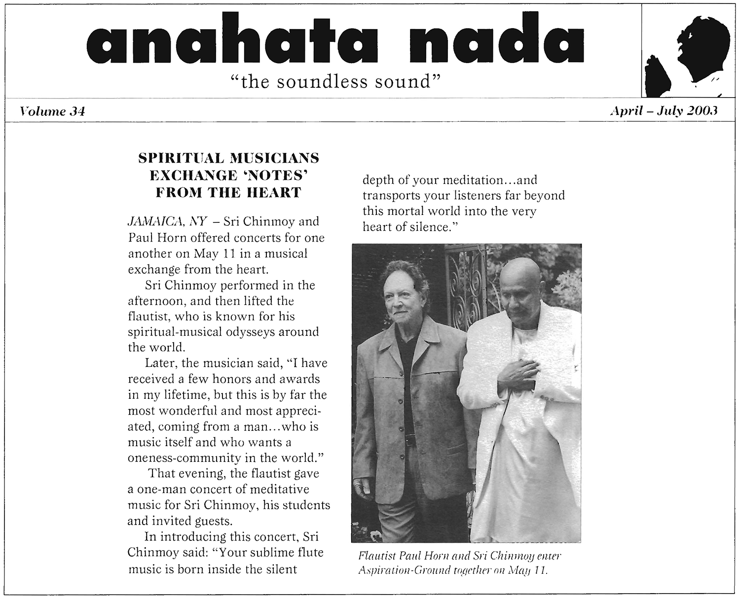 JAMAICA, NY — Sri Chinmoy and Paul Horn offered concerts for one another on May 11 in a musical exchange from the heart.