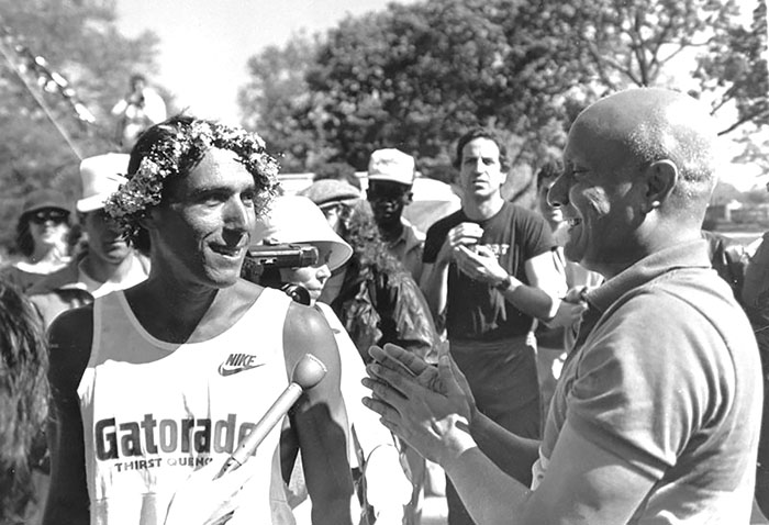 Sri Chinmoy congratulates Stu Mittleman, winner of the Sri Chinmoy 1,000-Mile Race, at Flushing Meadows Park in Queens, New York.