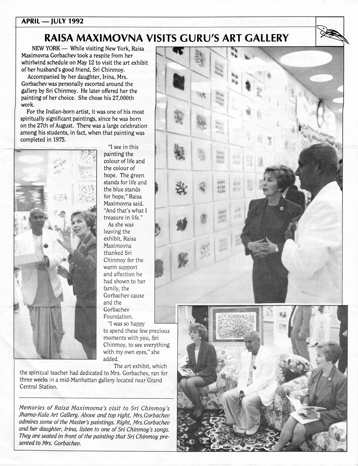 NEW YORK – While visiting New York, Raisa Maximovna Gorbachev took a respite from her whirlwind schedule on May 12 to visit the art exhibit of her husband's good friend, Sri Chinmoy.