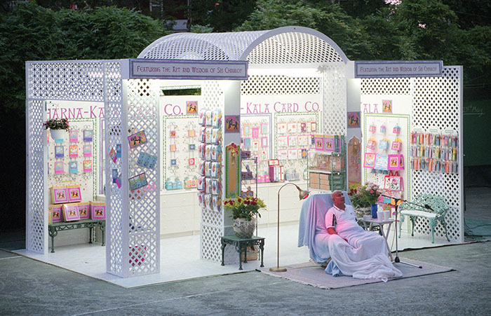 1998 Photo by Pulak Viscardi Sri Chinmoy meditates in front of the Jharna-Kala Card Co. display at Aspiration-Ground in Jamaica, New York.